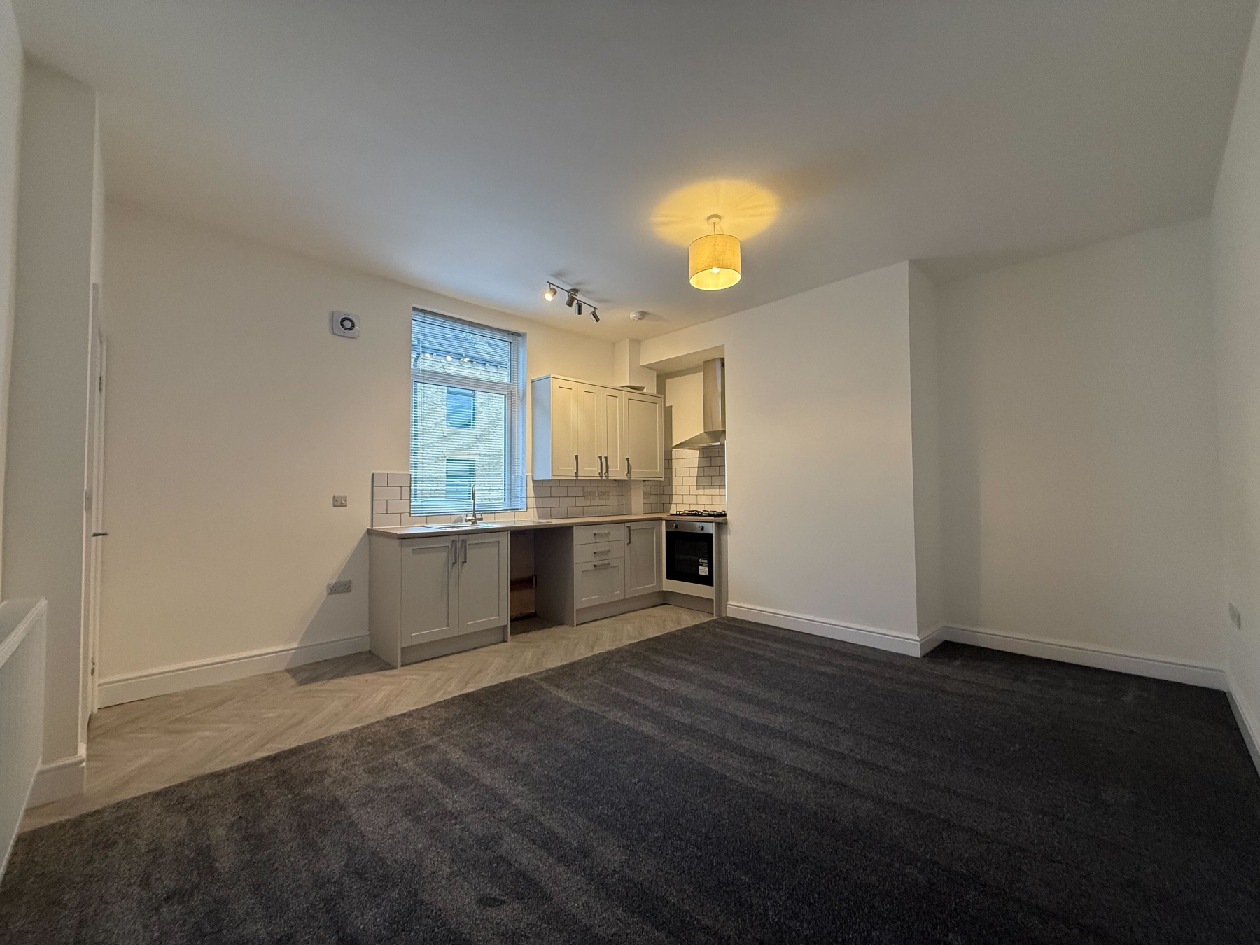 A modern, light grey fitted kitchen with ample worktop and storage space, including plumbing for a washing machine. The kitchen opens into a comfortable, carpeted living area, creating a bright and practical living space.