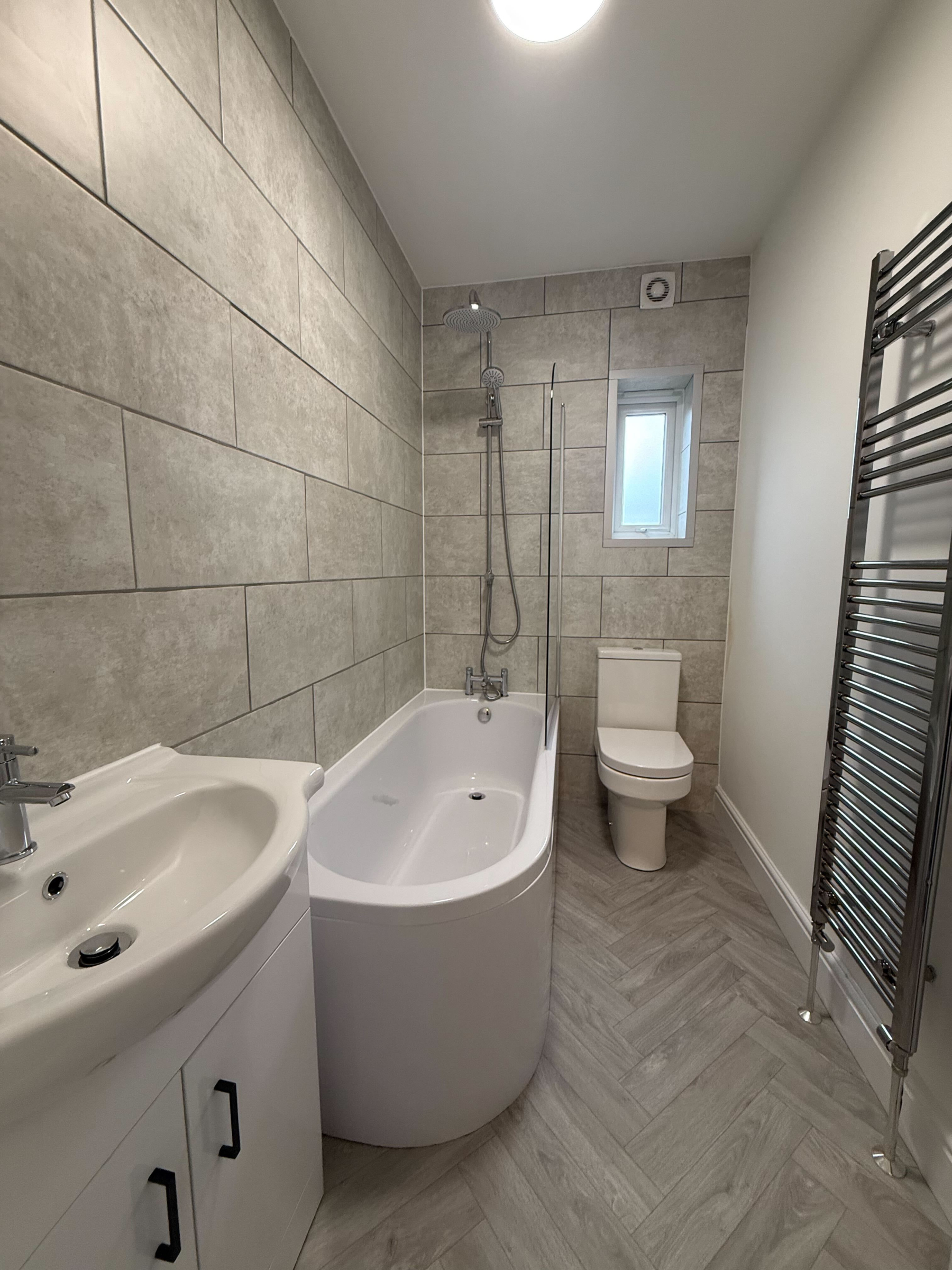 Stylishly finished with a dual-head shower over bath, vanity sink unit and modern tiling.