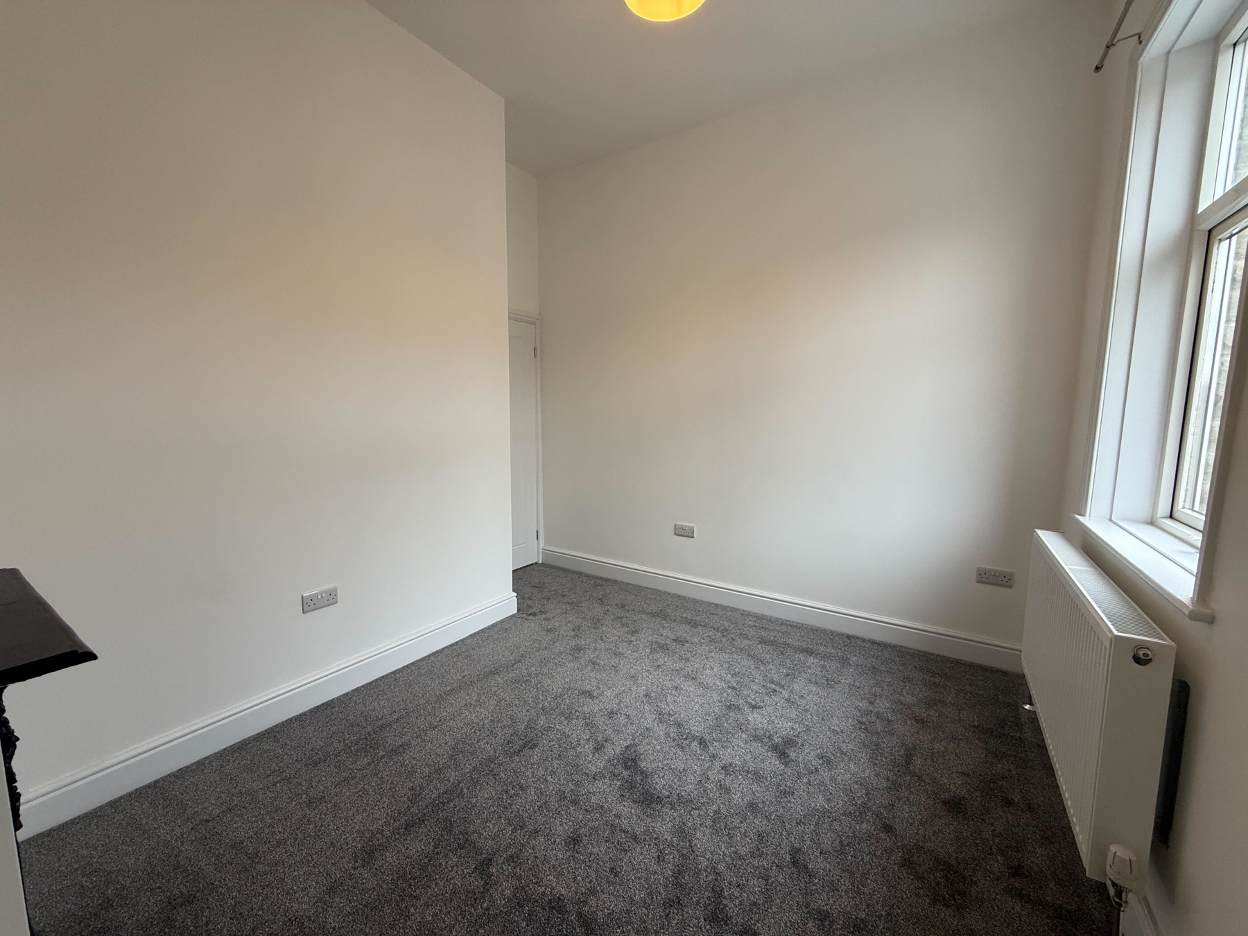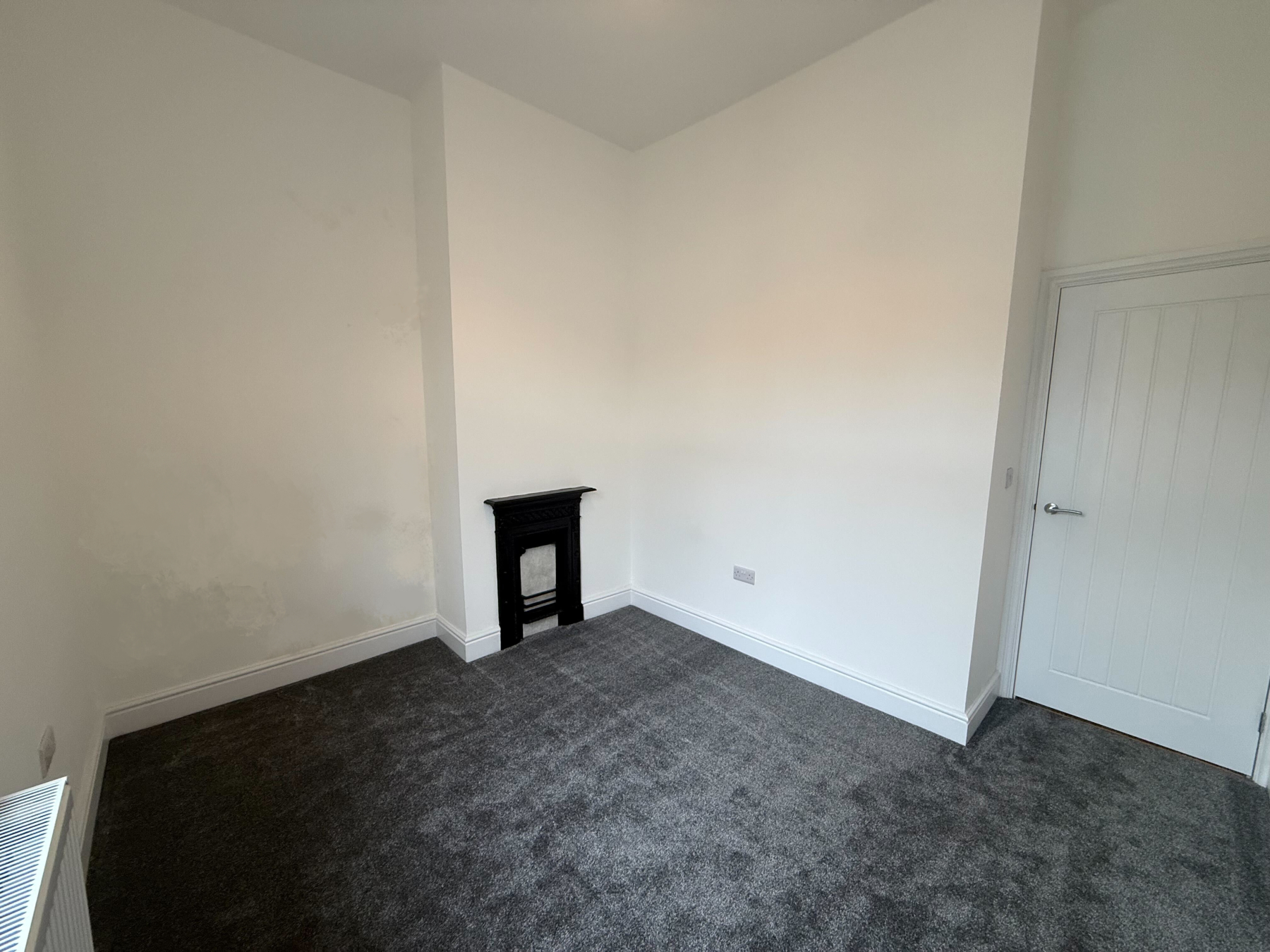 A spacious double bedroom with original decorative fireplace and room for wardrobes and additional storage.