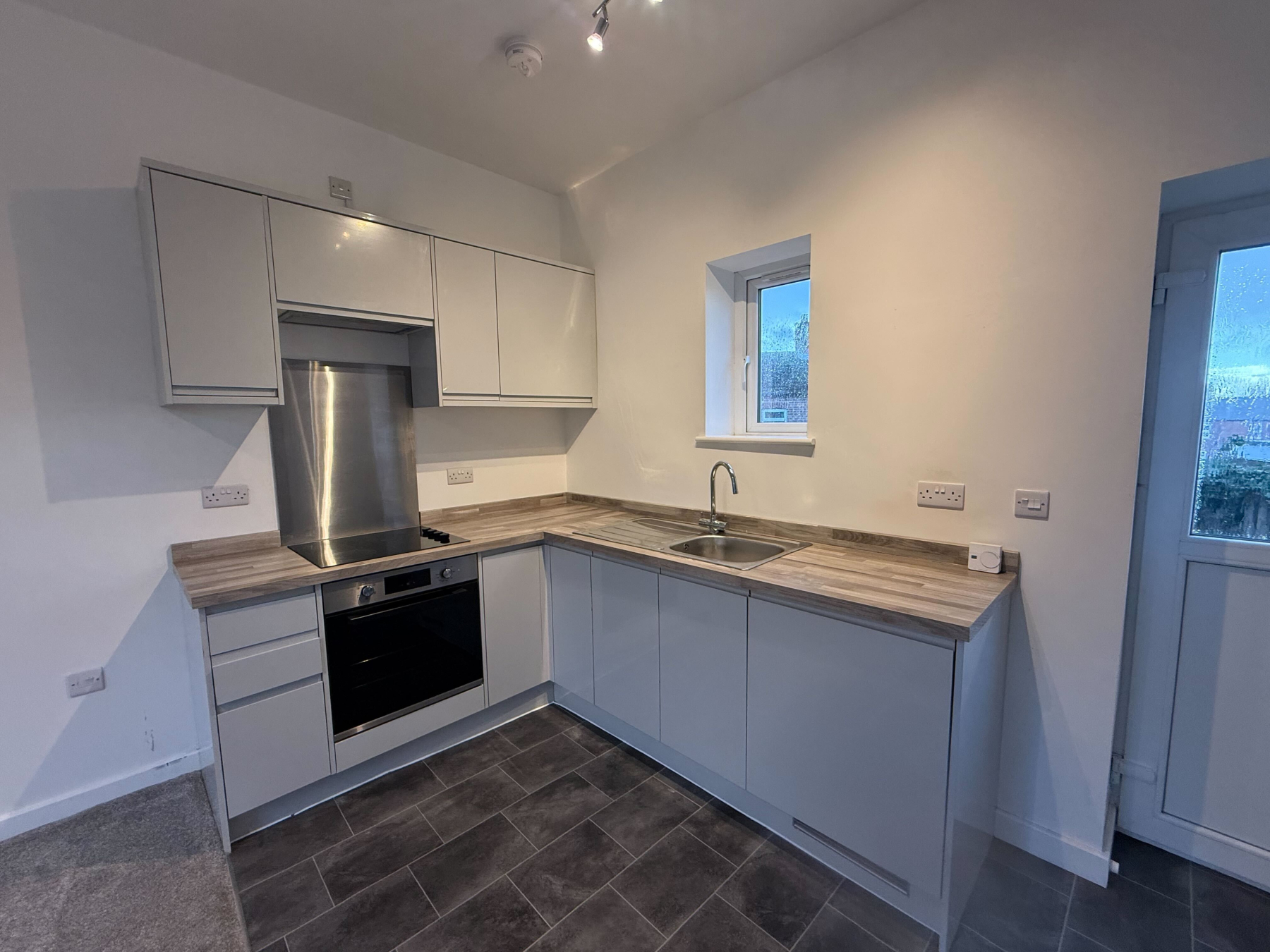 A modern light-grey fitted kitchen offering ample worktop and storage space, with plumbing for a washing machine & door leading to the garden. The carpeted living area is at the front of the property leading to stairs to the first floor.