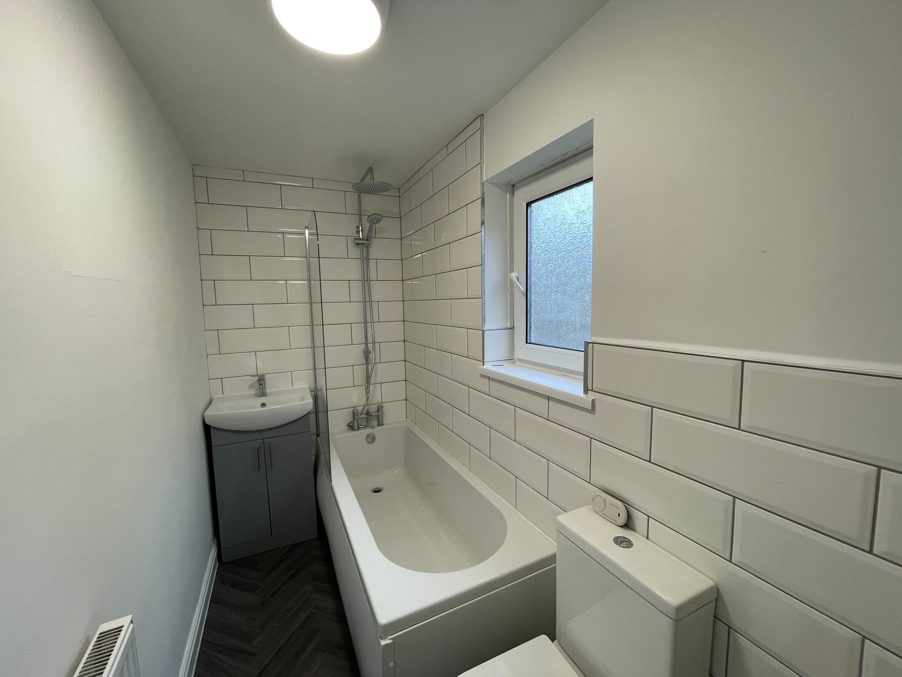 To the first floor, the property offers a spacious double master bedroom, a smaller single bedroom, and a bathroom fitted with a white suite and a shower over the bath.
